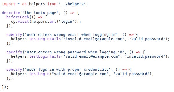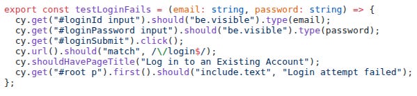 There are three tests here: invalid email; invalid password; and successful login. The beforeEach has each test start by navigating to the login page: cy.visit(helpers.url(”login”)). This is the equivalent of the user pasting the login URL into the address bar and pressing enter. Most of the work in these tests has been pulled out into helper methods, since they are used in more than one place. Here is testLoginFails:
