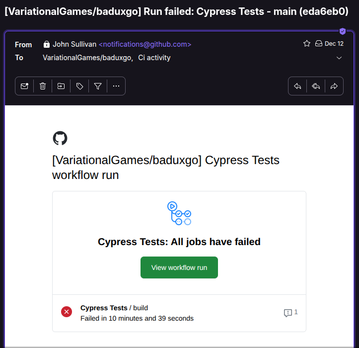 I started working on my functional test suite very early on in the Badux Go development process. I was implementing features like account creation; logging in and out; game invite creation; and accepting invites. I was pretty happy because I had full coverage for all these features. But I wasn’t able to get it working in continuous integration. Every time I push a code change up to GitHub, my continuous integration suite runs: it compiles all the back end code, and makes sure all the back end tests pass. But I hadn’t figured out yet how to get my Cypress tests running in GitHub.